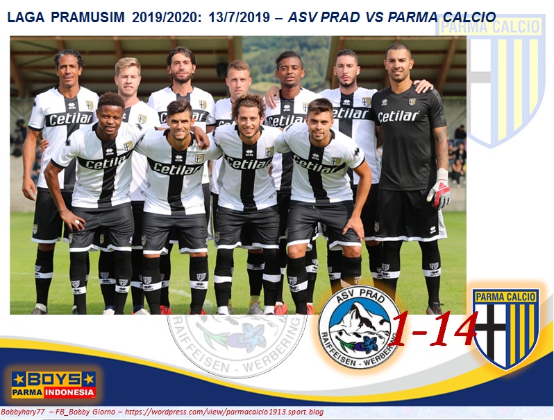 Parma Calcio berhasil unggul jauh atas tim amatir Prato Allo Stelvio dengan selisih margin 13 gol. Skor akhir 1-14 menjadi pencapaian positif dalam laga pembuka pramusim klub Gialloblu. Delapan gol yang dicetak di babak kedua melengkapi pencapaian enam gol yang sebelumnya telah dilesakkan ke gawang ASV Prad di babak pertama. Sprocati yang menjadi targetman di sektor depan berhasil unjuk gigi dengan membukukan empat gol di menit ke 11’, 18’, 27’, dan 31’. Pada menit ke 22’ Gagliolo berhasil membukukan gol berikutnya melalui overlap. Pemain gaek Munari juga ikut memberikan andil kemenangan dengan golnya di menit ke 37’. Selanjutnya Yves Baraye yang membuat namanya tertulis dua kali di papan skor masing-masing pada menit ke 42’ dan 65’. Pemain debutan, Brunori juga tidak ketinggalan meunjukkan skill golnya di menit ke-84’. Jacopo Dezi menjadi bintang yang bersinar terang dengan mencetak poker di menit 31’, 58’, 69’, 76’, dan 81’. Tim tuan rumah hanya mampu membalas dengan gol tunggal yang dicetak Gander melalui titik putih pada menit ke 22’.